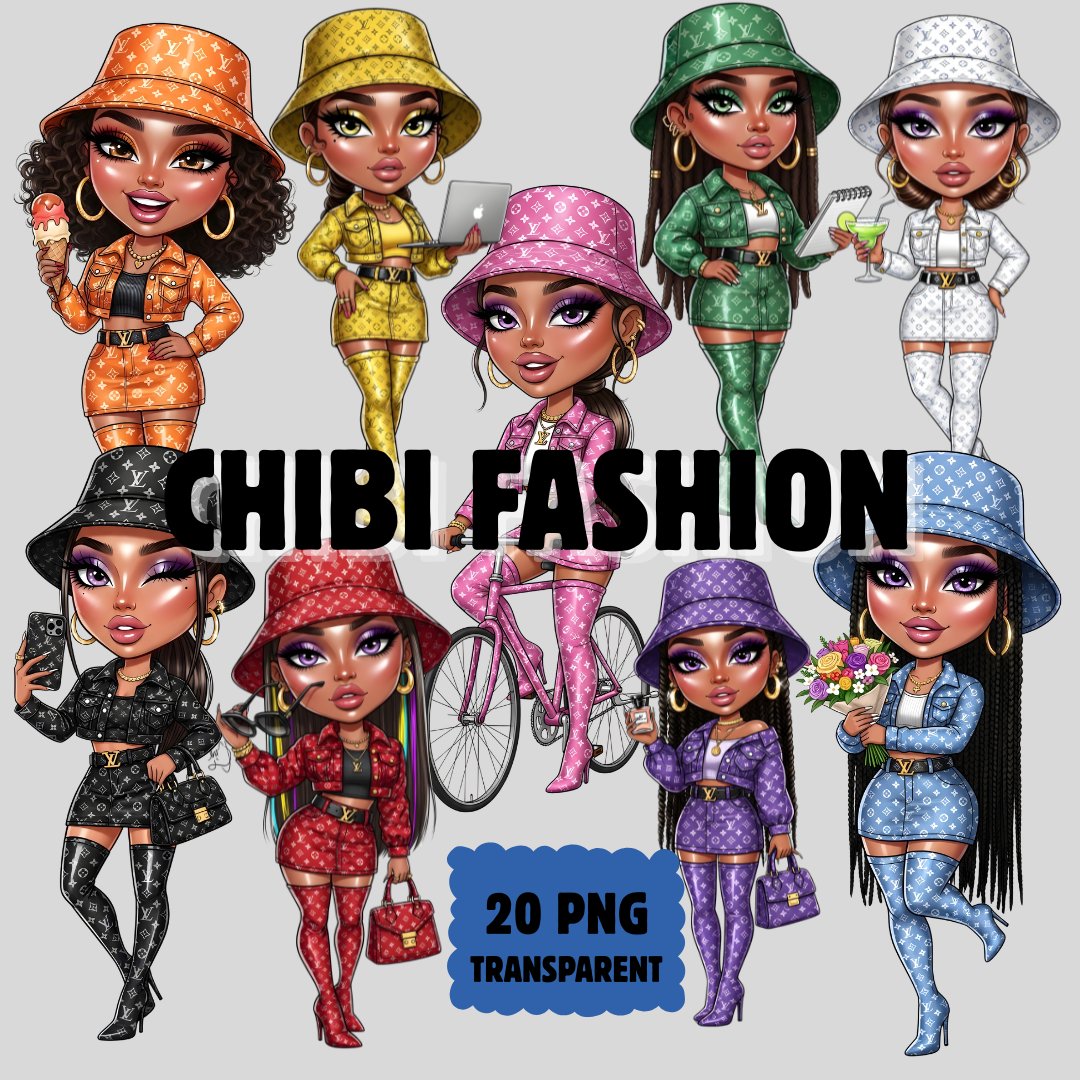 Add a bold, stylish touch to your creative projects with this set of 20 high-resolution Chibi clipart designs. Each character is designed with a glossy, fashion-forward aesthetic, perfect for digital creators, small business owners, and content designers looking to elevate their brand visuals.