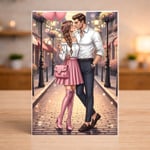 Featuring a beautifully illustrated couple sharing a romantic moment beneath glowing streetlights, this design captures the magic of love, intimacy, and dreamy evenings. Soft pink tones, heart-shaped balloons, and twinkling lights create a warm, whimsical atmosphere that feels both timeless and modern.